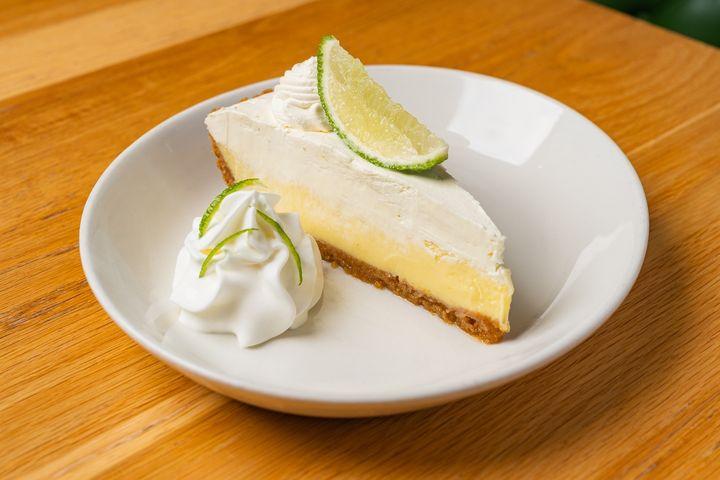 Sweet and tart key lime custard on a graham cracker crust with whipped cream.
