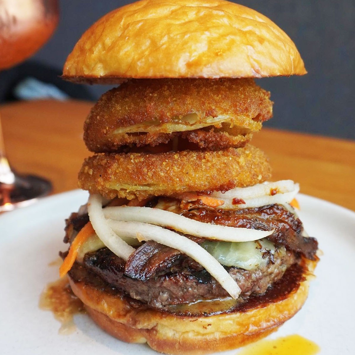 Grilled jalapeño and caramelized onions, pepper jack, smashed avocado, fried jalapeño coins and green chili aioli on a brioche bun.