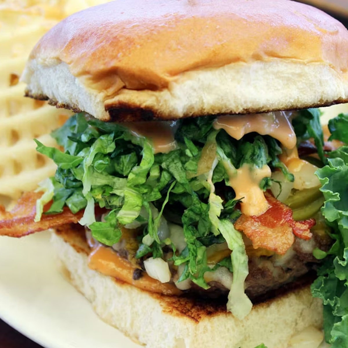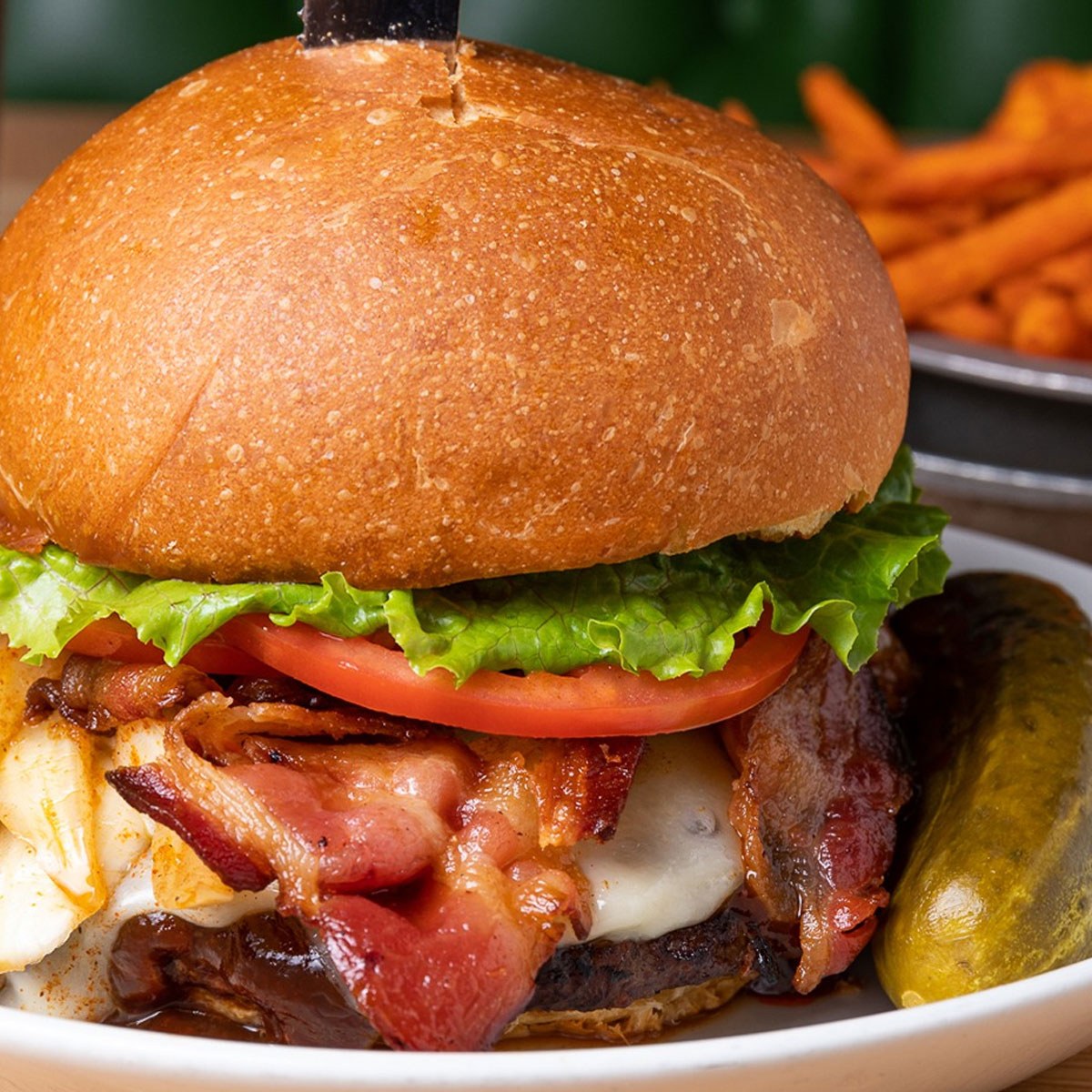 It’s a classic burger with crispy bacon and melted cheese—simple, satisfying, and dependable.