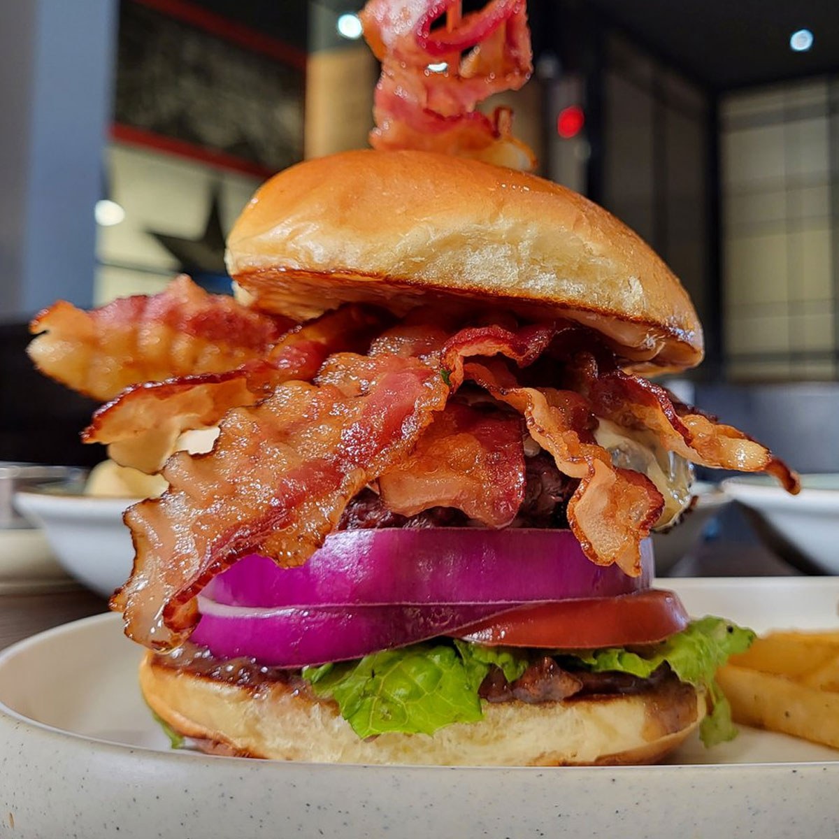Dave & Buster’s is known for combining arcade games, sports viewing, and casual dining, and their Buster’s Bacon Burger delivers big flavor to match the high-energy atmosphere. This 7-ounce burger is generously topped with applewood-smoked bacon, American cheese, bacon jam, lettuce, pickles, tomato, onions, and bacon aioli, creating a rich and savory combination in every bite.