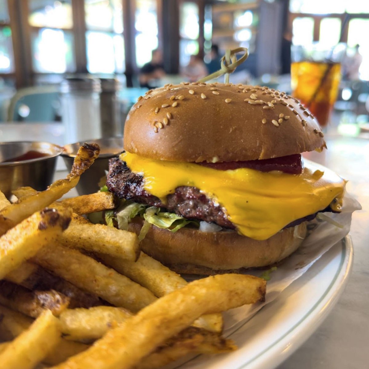 Instead of traditional fries, it’s served with fresh country potatoes and a pickle, giving the burger a brunch-inspired twist that fits perfectly with Another Broken Egg’s daytime dining style.