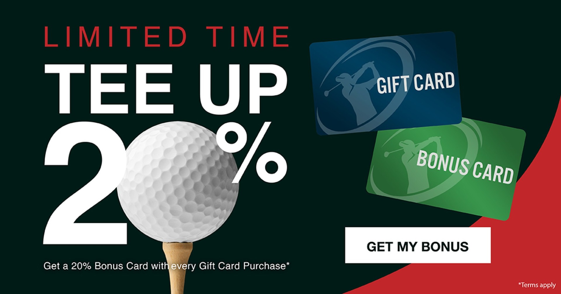 Dates: November 17 – December 31 LIMITED TIME: Get a 20% Bonus Card with every Gift Card Purchase from Club Champion! Terms: Get a 20% Bonus Card on the value of your Gift Card or eCard purchased online from 11/17/2025 - 12/31/2025. Bonus Card value expires 1/31/2026. Bonus Cards are only available for eCards purchased online at clubchampion.com/products-services/gift-cards. Bonus Card may not be redeemed for 24 hours after purchase. Limit three Gift Cards per household; $1,000 limit per card. Cards valid at Club Champion US locations only. Gift Cards are subject to Terms and Conditions. Offer not valid on prior Gift Card purchases. Bonus Card cannot be redeemed for cash or credit; Gift Cards and Bonus Cards are non-refundable. Bonus Card may be used toward golf club equipment and build purchases only; fittings and other service fees are excluded. Bonus Cards cannot be used to purchase Club Champion Gift Cards. Gift Cards and Bonus Cards cannot be used at Club Champion's online store. We reserve the right to decline or suspend any sale, for any reason if we suspect fraud or misuse of the bonus value promotion. Void where prohibited. Offer subject to change without notice.