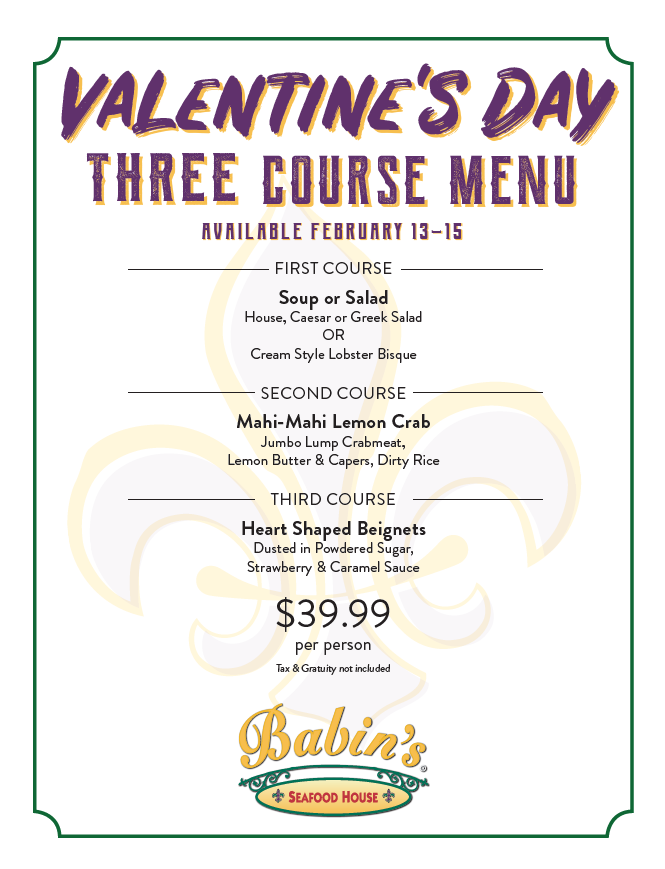 Babin's Seafood House is offering a great Valentine's Day meal for you and your sweetie. Enjoy a three-course meal for $39.99 per person. The meal includes: FIRST COURSE Soup or Salad House, Caesar or Greek Salad OR Cream Style Lobster Bisque SECOND COURSE Mahi-Mahi Lemon Crab Jumbo Lump Crabmeat, Lemon Butter & Capers, Dirty Rice THIRD COURSE Heart Shaped Beignets Dusted in Powdered Sugar, Strawberry & Caramel Sauce $39.99 per person Tax & Gratuity not included