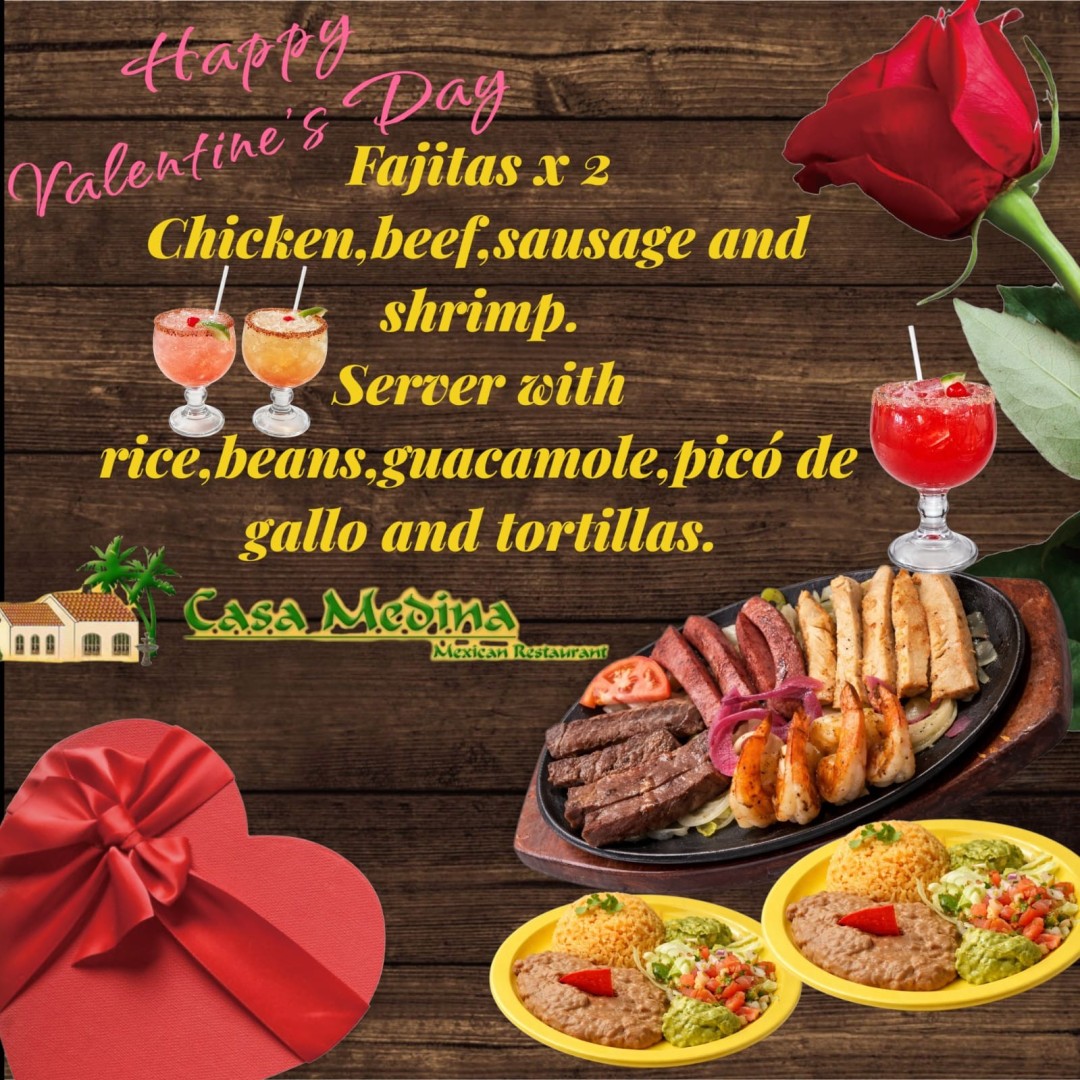 For Valentine's Day, Casa Medina is offering Fajitas for 2 - Chicken, Beef, Sausage, and Shrimp, served with rice, beans, guacamole, pico de gallo and tortillas.