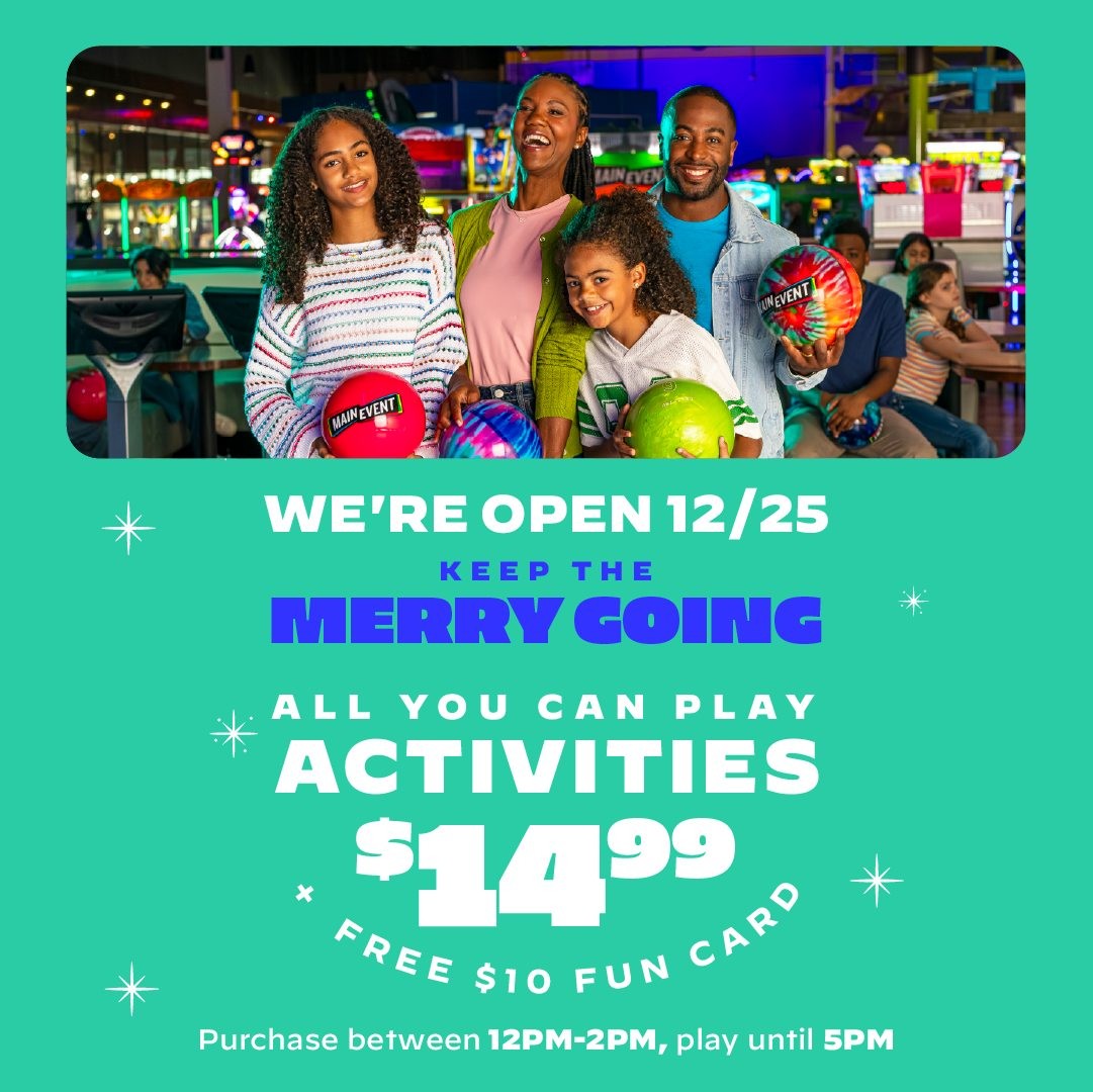 Christmas morning is gone in a flash, but you can keep the magic going all afternoon at Main Event! Get All You Can Play Activities for $14.99 and a free $10 fun card. Must purchase between noon and 2PM valid until 5PM.