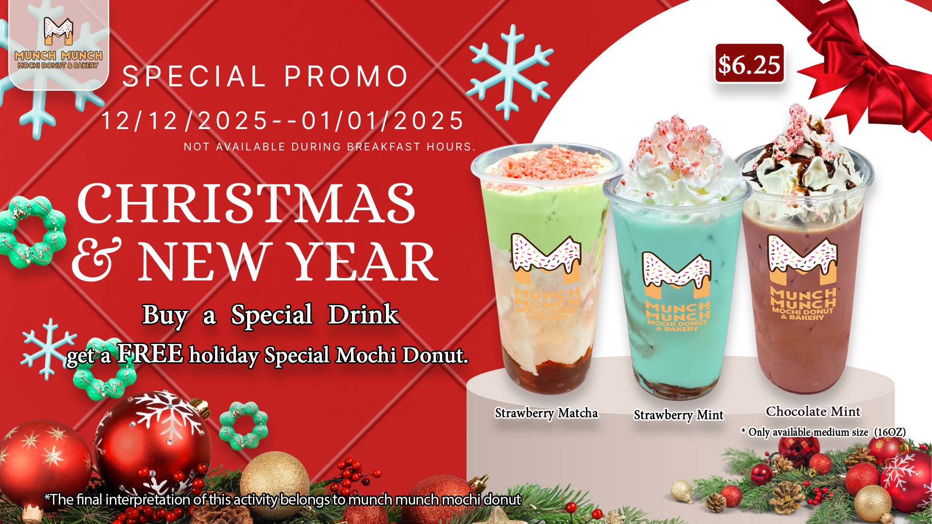 Celebrate Christmas & New Year with a sweet seasonal deal you don’t want to miss! - Buy a Special Holiday Drink - Get a FREE Holiday Special Mochi Donut - Dates: 12/12/2025 – 01/01/2025 - Not available during breakfast hours - Holiday Drinks: $6.25 (Medium 16oz only) - Featured flavors include: - Strawberry Matcha - Strawberry Mint - Chocolate Mint Stop by, sip something festive, and enjoy a little extra holiday sweetness—on the house! Munchmunchmochidonut & Bakery 19189 INTERSTATE 45, SUITE #M Shenandoah, TX 77385 (346) 331-6184
