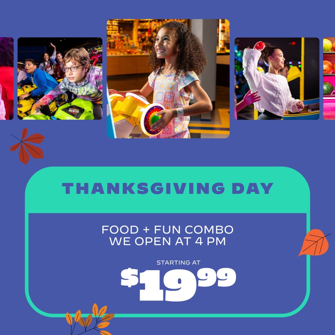 Main Event opens at 4pm on Thanksgiving Day and will have a food and fun combo starting at $19.99.