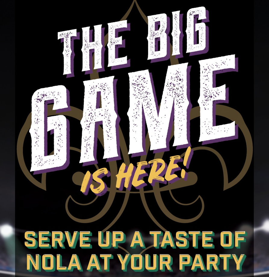 THE BIG GAME IS HERE! SERVE UP A TASTE OF NOLA AT YOUR PARTY LET THE BATTLE BEGIN AT YOUR TAILGATE AND SCORE BIG WITH CAJUN-INSPIRED PARTY PLATTERS! • SHRIMP KISSES • SPINACH & CRAB DIP • SEAFOOD GUMBO & MORE