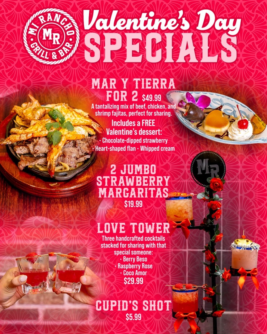 MI RANCHO GRILL & BAR MR Valentine’s Day SPECIALS MAR Y TIERRA FOR 2 $49.99 A tantalizing mix of beef, chicken, and shrimp fajitas, perfect for sharing. Includes a FREE Valentine’s dessert: • Chocolate-dipped strawberry • Heart-shaped flan • Whipped cream 2 JUMBO STRAWBERRY MARGARITAS $19.99 LOVE TOWER Three handcrafted cocktails stacked for sharing with that special someone: • Berry Beso • Raspberry Rose • Coco Amor $29.99 CUPID’S SHOT $5.99