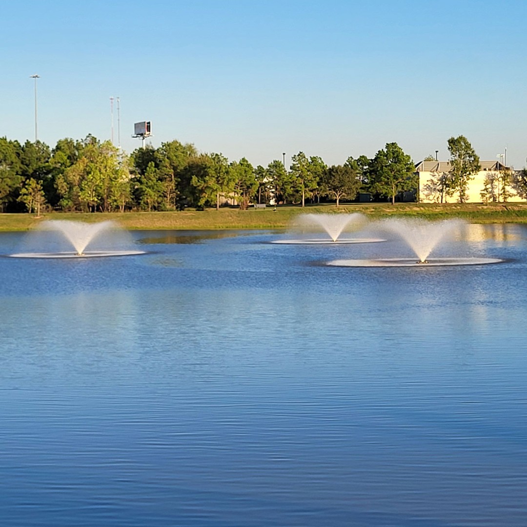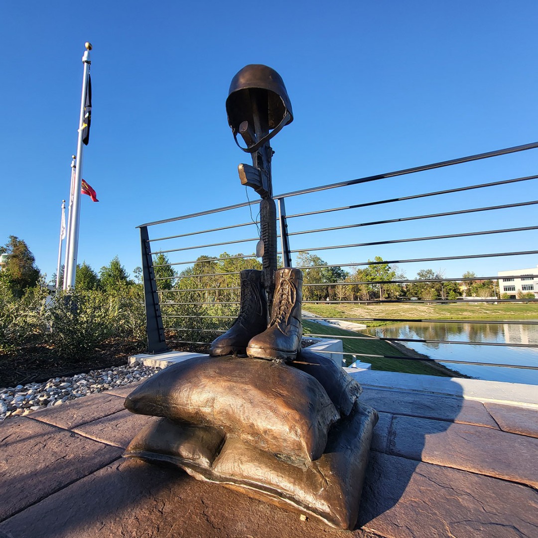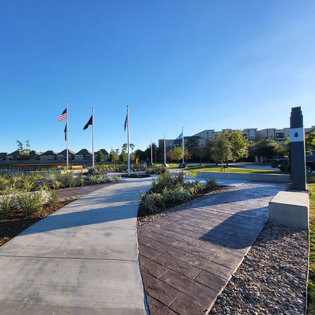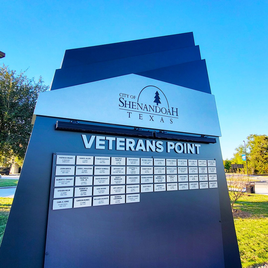 Shenandoah’s Vision Park, dedicated in Spring 2024, is the city’s newest community green space, centered around a scenic pond with three LED-lit fountains, a ½-mile walking and biking loop, benches, and a striking stone-and-steel bridge. On the park’s northwest side sits Veterans Point, a moving plaza honoring Shenandoah residents who served in the U.S. Armed Forces. Dedicated on Veterans Day 2024, the plaza features memorial panels listing veterans’ names, lush landscaped beds, seating areas, and life-sized Corten steel soldier silhouettes positioned along the pathway. A unique overlook mimics a ship’s bow and sits beside a battlefield cross sculpture with views of the water. Ten illuminated flagpoles proudly display the U.S., Texas, City of Shenandoah, all six military branches, and POW/MIA flags. Each Veterans Day, the city plans to host ceremonies and update memorial names annually.